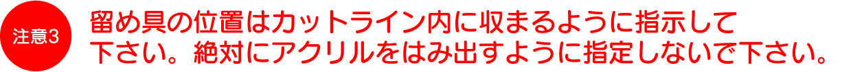 | 留め具の位置を指定するためのレイヤーがテンプレート内にありますので、動かして位置をして下さい。絵柄の中心より少し上に指定すると良い感じに仕上がります。 回転してもかまいませんが、カットラインからハミ出さないようにご注意下さい。 また透明アクリル等を使っている場合、下地の白印刷のある部分に指定したほうが、オモテ面から留め具が透けて見えることがないので、見栄えがよくなります。 |