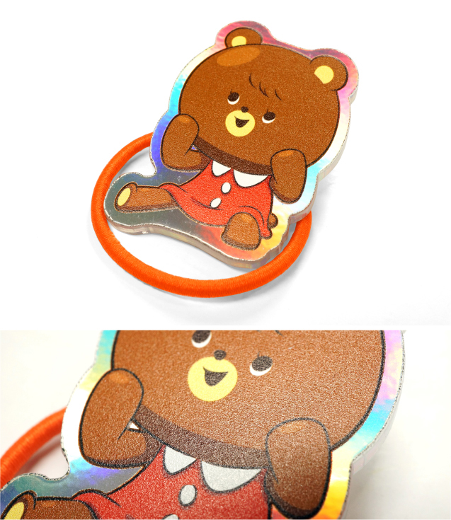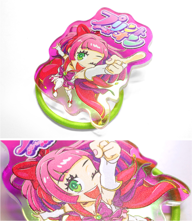 | Sサイズ/ホログラムアクリル ジュエル ピンク(透明)/片面印刷(フルカラー+白印刷) ヘアゴムの色:グリーン |