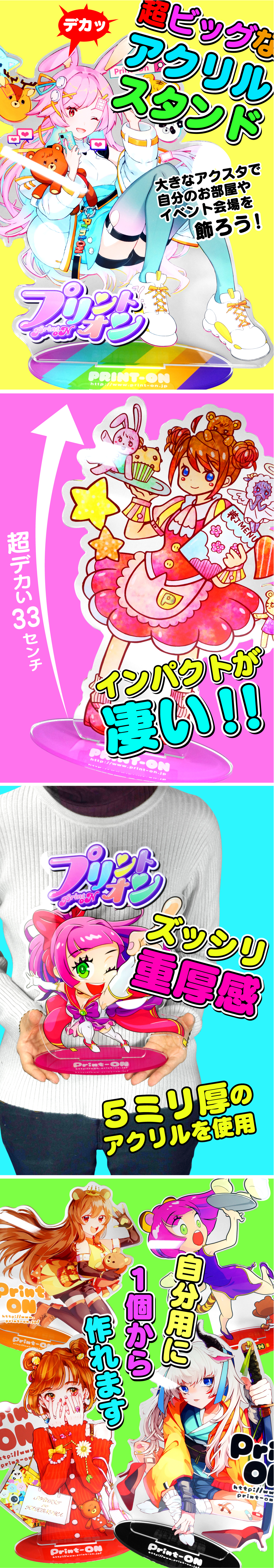 高さ33センチの超BIGなアクリルスタンドが作れます。 分厚いアクリル(5ミリ)の透明アクリルに印刷出来ます。 |