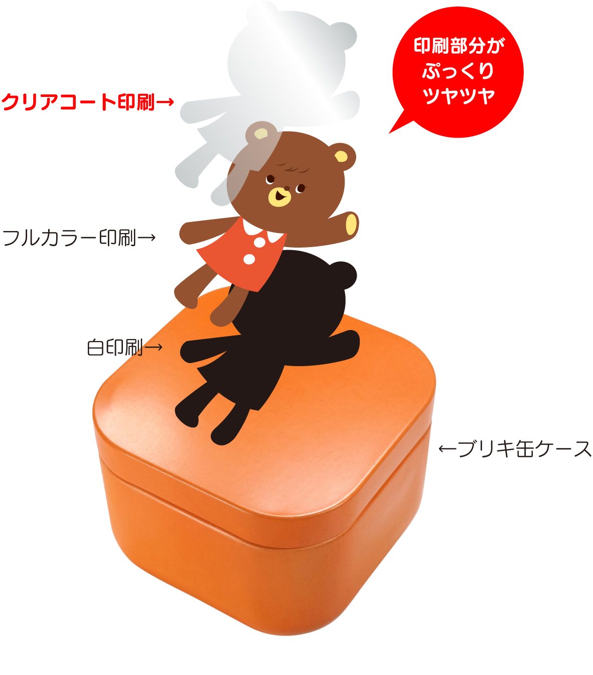 | 印刷面にクリアコート処理でぷっくり可愛く、キズも防げます。 ご注文時にクリアコートを選択するだけで簡単にご利用可能です。 フルカラー+白印刷後に印刷部分に光沢と厚みのあるクリアインクでコーティングします。ぷっくり厚みのある加工ですので、可愛いだけじゃなく、触っても楽しめます。表面の保護的な役割も果たしてくれますので、是非ご利用下さい。 ※クリアコート用にデータを用意する必要はありません。 ※クリアコート部分には気泡穴が入る場合があります。 特に広いベタで発生しやすくなり、品質上避けられません。予めご了承下さい。 ※料金が1個40円加算されます。 ※締切が1営業日加算されます。 |