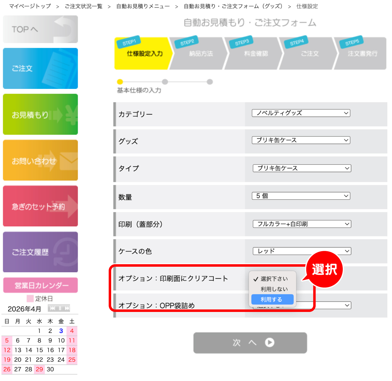 | ※特別締切でオプションをご利用の場合、加算納期分締切が早まります。 ※オプション料金は割引の対象外となります。 |