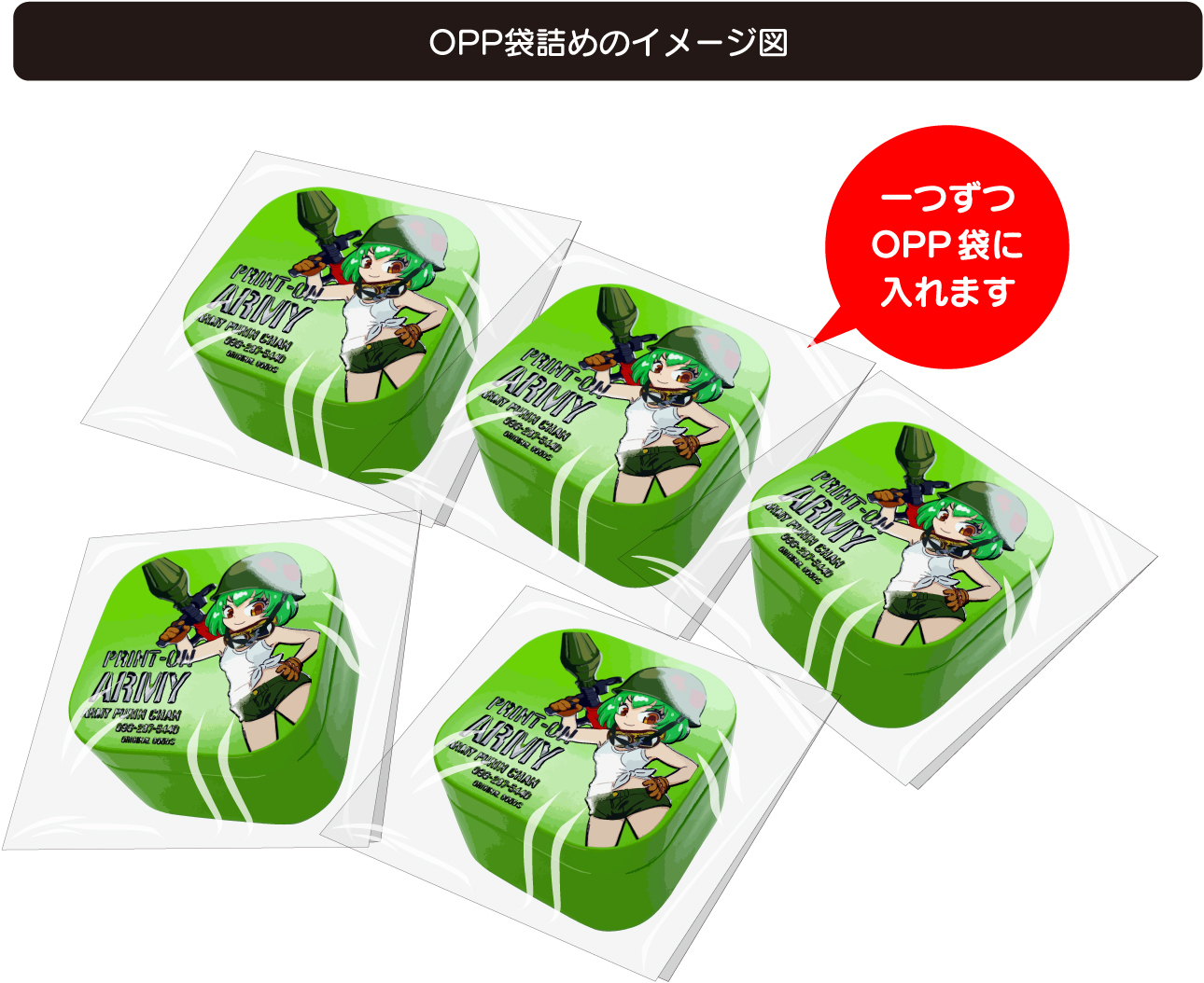 | 1個ずつOPP袋に入れて納品致します。 ブリキ缶ケースのサイズに合ったOPP袋に入れて納品致します。 ※締切が1営業日加算されます。 ※1個20円の加算料金が発生します。 |