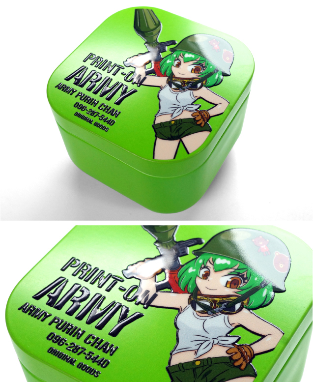 ブリキ缶ケース/グリーン/フルカラー(CMYK)+白印刷 |