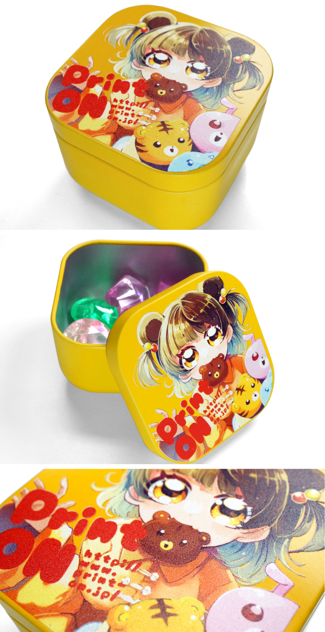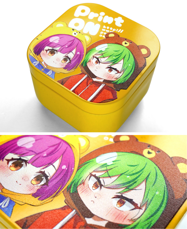 ブリキ缶ケース/イエロー/フルカラー(CMYK)+白印刷 |
