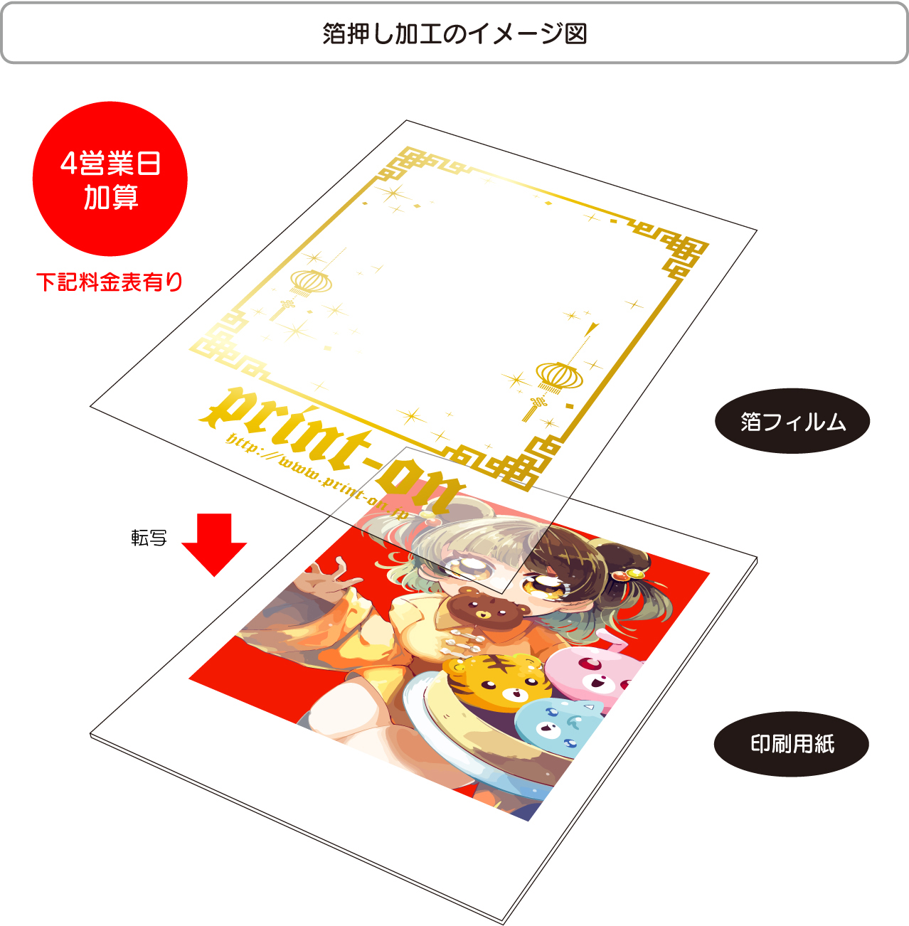 ※印刷と箔押し加工は別工程の為、若干のズレが発生しますので、位置合わせがシビアなデザインは避けて頂く事をお勧めいたします。