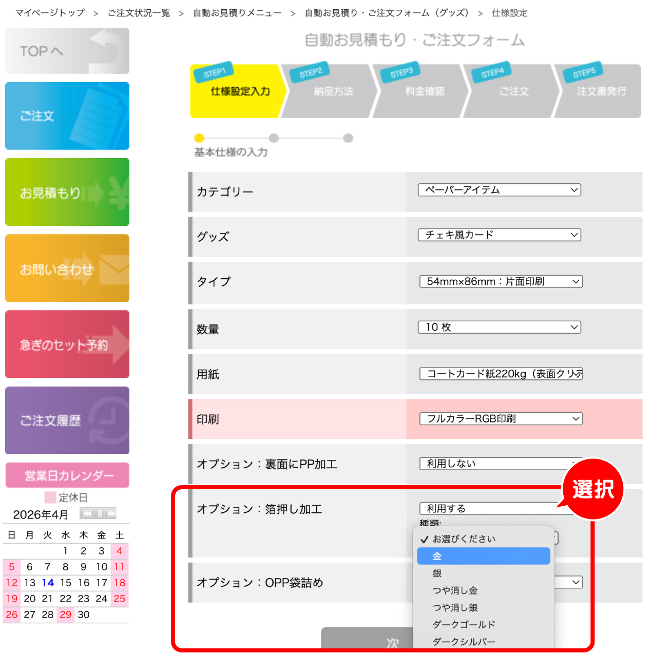 マイページでのご注文時に「オプション:箔押し加工」の項目で「利用する」を選択して