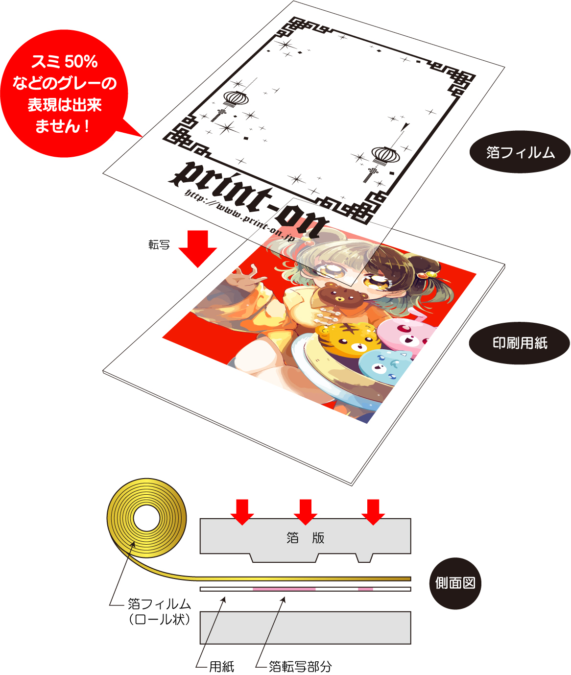 | 箔押しする部分をスミ100%で作成して下さい。グレーは表現不可。 |