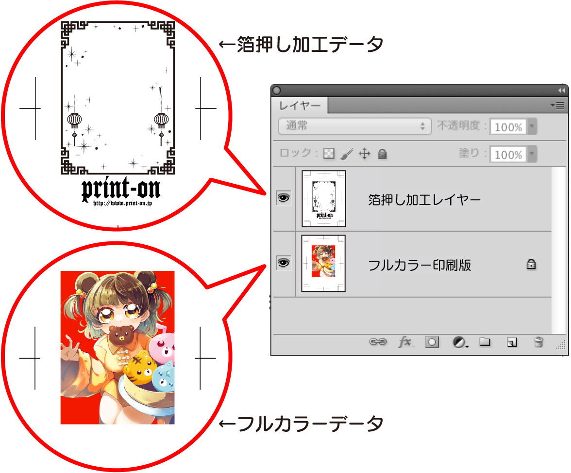 | フルカラー印刷データとはレイヤーで分けて、データ作成下さい。 箔押し加工は作業工程が別なので、フルカラー印刷データと若干のズレが生じます。 多少ズレても問題ないように箔押し加工部分の下にも絵柄を描いて下さい。 |
