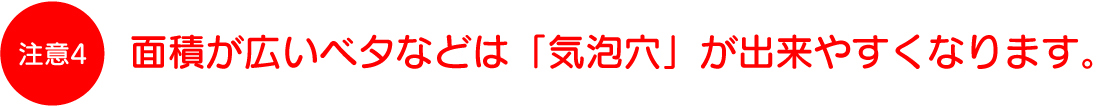 転写した時に用紙と箔の間に空気が入ってしまい、面積が広い為、空気の逃げ場所が無く、空気ごと箔押しするようになり、空気があった部分は箔が付かない気泡穴が出来易くなります。なるべくベタは避けた絵柄をお勧めします。予めご了承下さい。 |