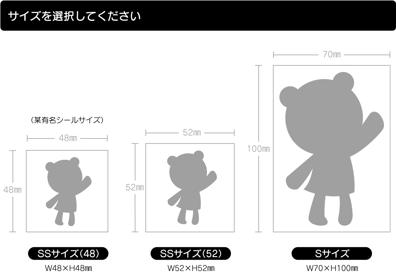 | サイズ | SSサイズ(48) タテ48mm×ヨコ48mm SSサイズ(52) タテ52mm×ヨコ52mm Sサイズ タテ100mm×ヨコ70mm |