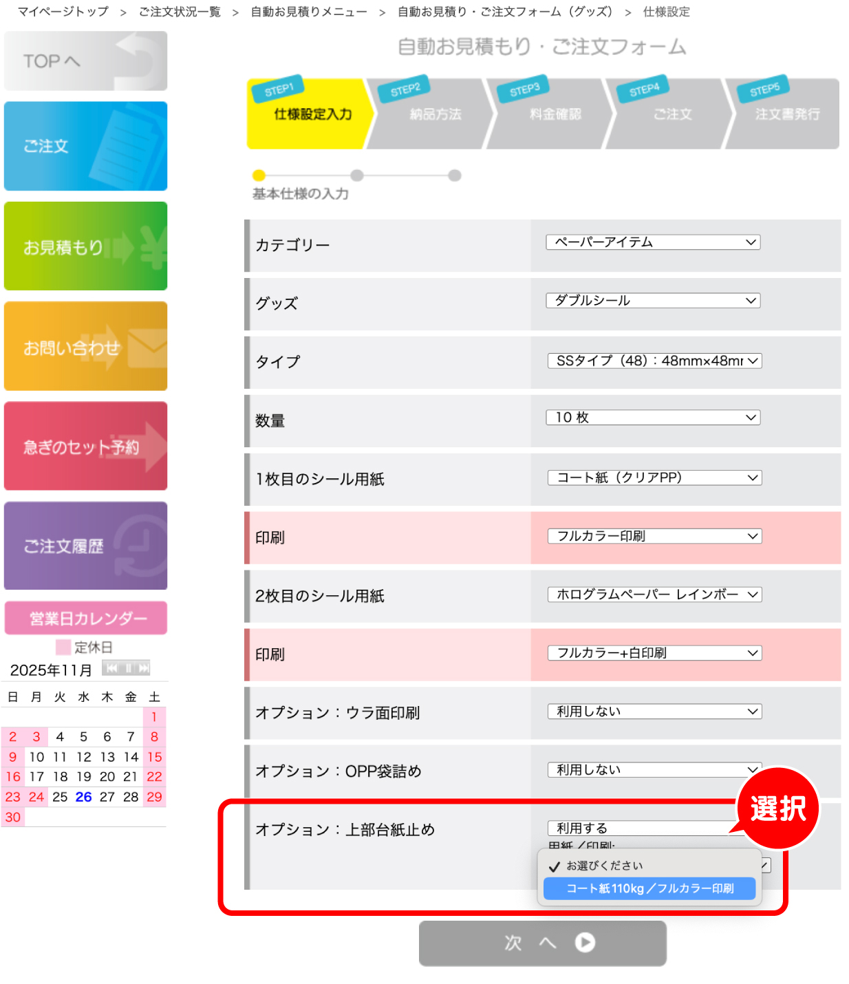 | マイページでのご注文時に「オプション:上部台紙止め」の項目で「利用する」を選択して下さい。 |