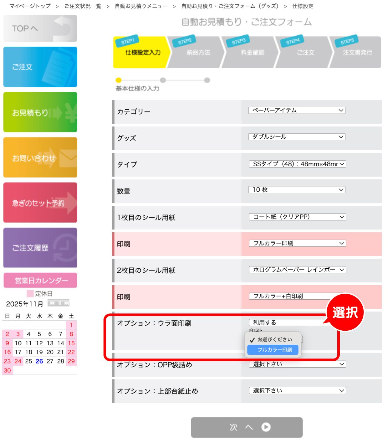 | マイページでのご注文時に「オプション:ウラ面印刷」の項目で「利用する」を選択して下さい。 |