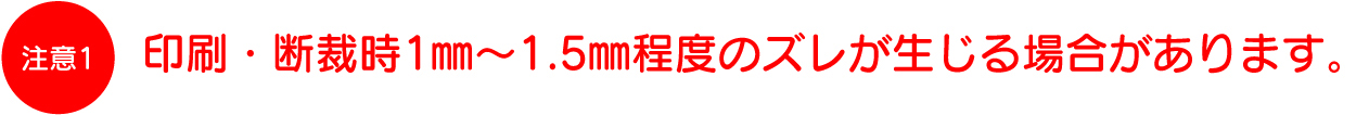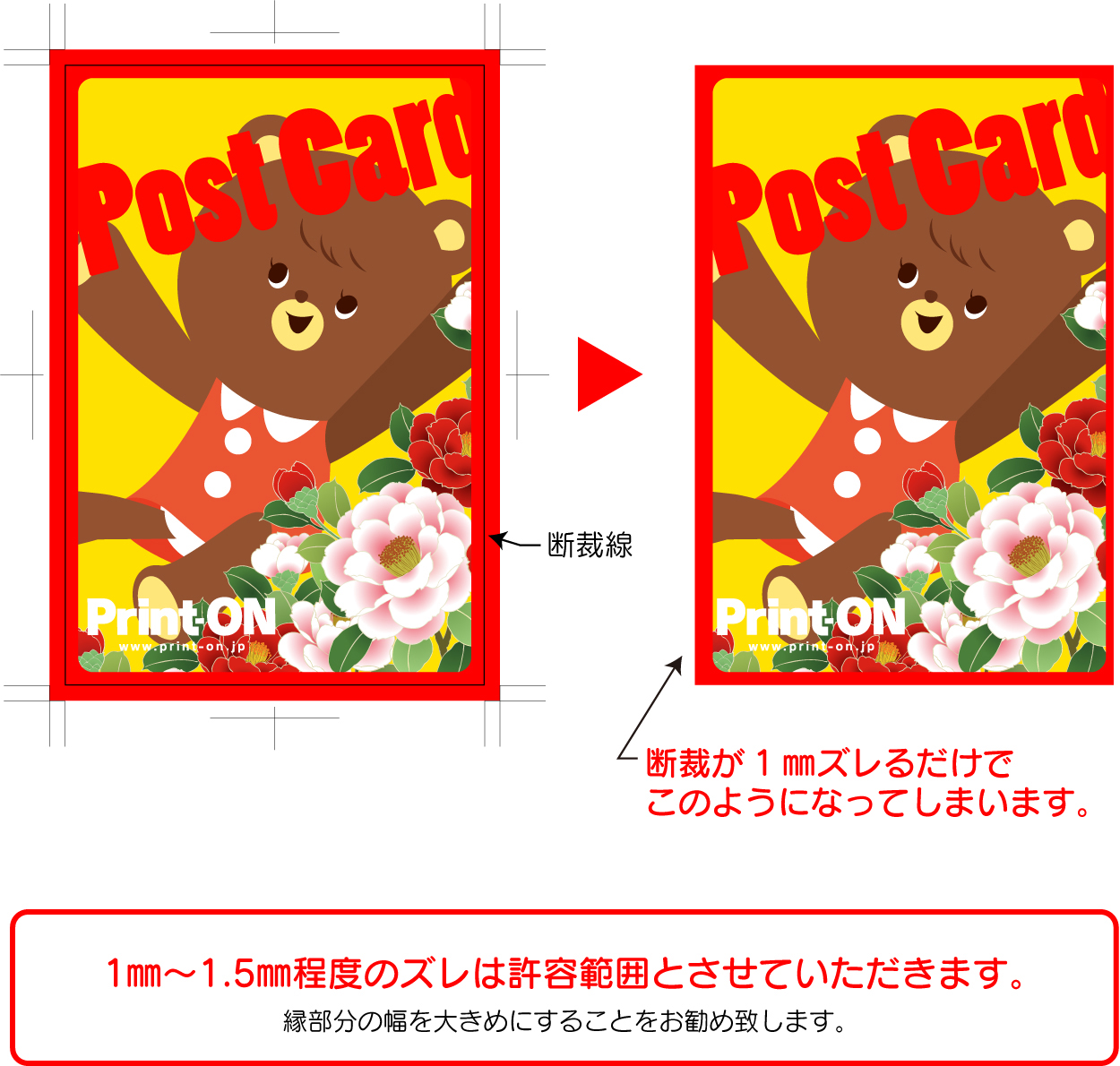 | ポストカードはサイズが小さい為、印刷や断裁の際に若干のズレが発生いたします。その為、1〜1.5o程度はズレが生じても大丈夫なデザインで作成してください。 特に縁があるようなデザインの場合、微少なズレでも上下左右の縁の幅が変わる為、目立ち易くなりますのでご注意ください。 |