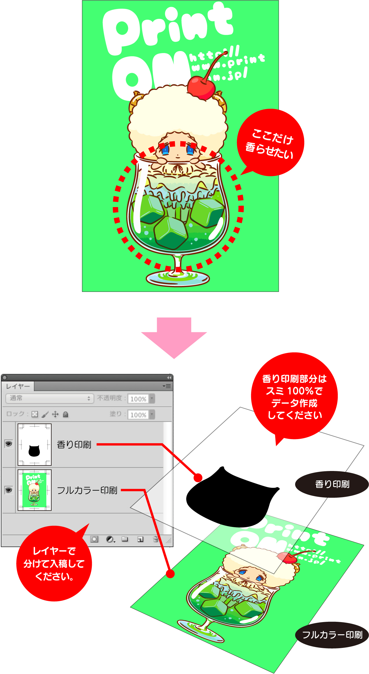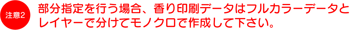 | 専用オプションで「香り印刷の部分指定」を行う場合、香り印刷データは必ず、フルカラー印刷データとはレイヤーで分けて、モノクロで作成して下さい。スミ100%(黒い)部分に香り印刷を施します。 専用オプションで「香り印刷の部分指定」を選択される場合のみの注意事項です。通常はオモテ面全面に香り印刷を施す為に、この注意事項は関係ありません。 |