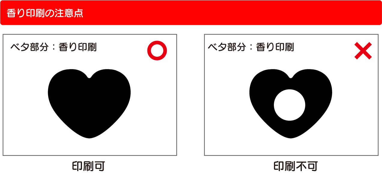 | 作業工程上、ドーナツ状になった香り版での印刷は不可です。 小部数用の簡易的な香り版を使用しますので、中マド状になった絵柄は版が抜け落ちて しまうので、印刷不可です。ご了承下さい。 |