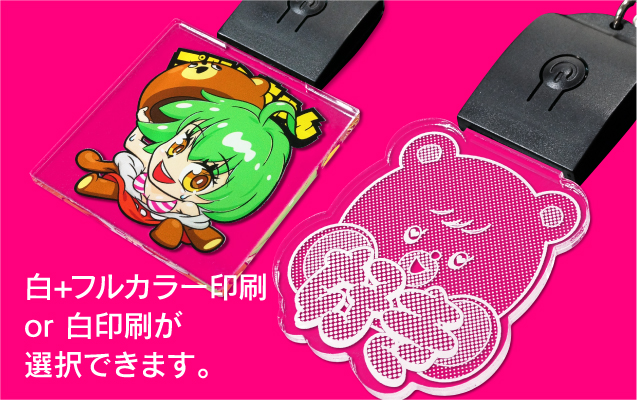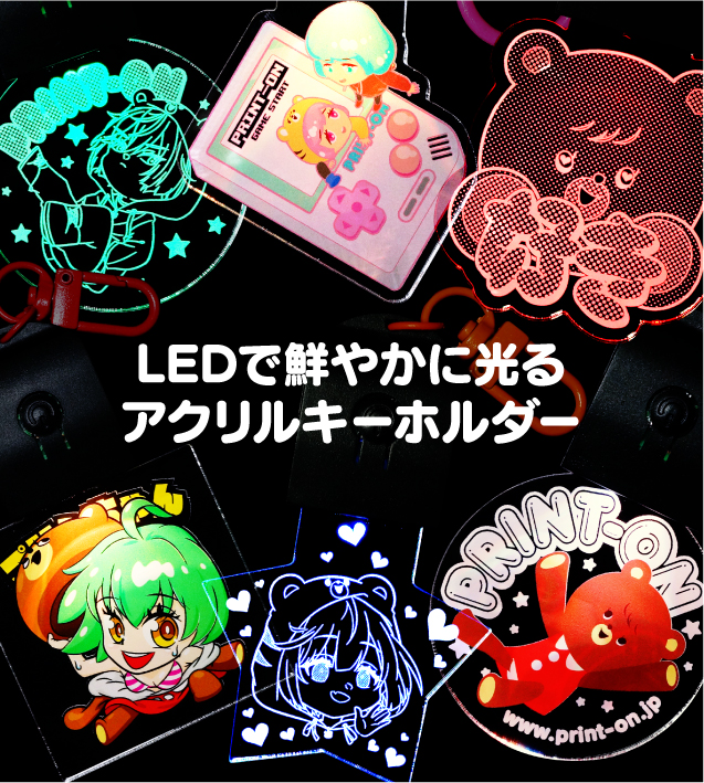 LED内蔵で光り輝くアクリルキーホルダーが作成できます。 ※白のベタやアミ、フルカラー印刷部分が広くなると光が弱くなります。白印刷のみの線画での入稿をお勧めします。 ※電池はテスト用のため寿命が短い恐れがあります。 |