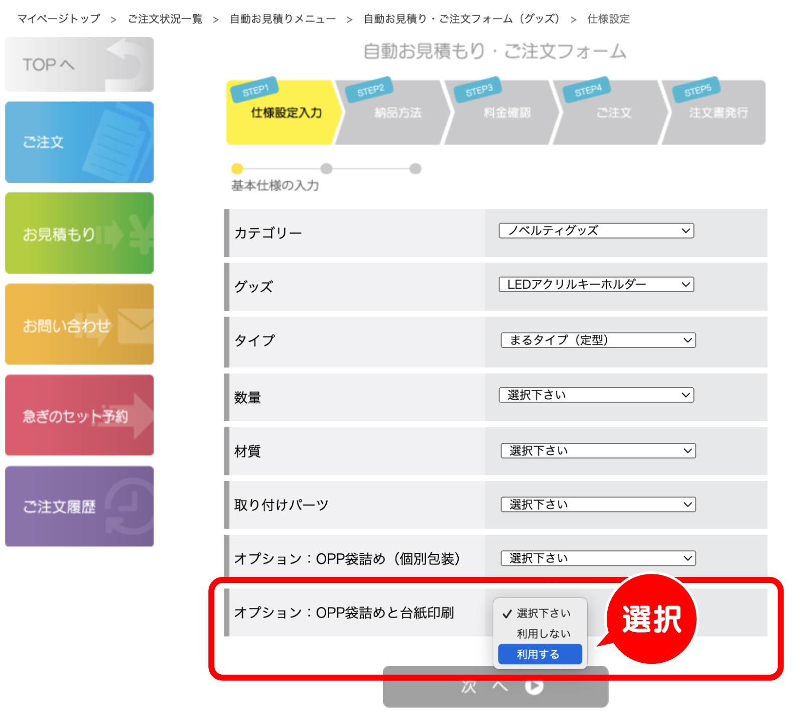 | マイページでのご注文時に「オプション:OPP袋詰めと台紙印刷」の項目で「利用する」を選択して、 用紙と印刷方法を選択下さい。 |