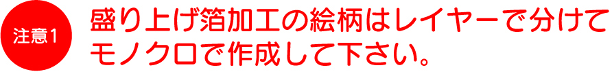 | フルカラー印刷データと盛り上げ箔加工データはレイヤーで分けて、データ作成下さい。。 また、白印刷をご利用される場合も白印刷部分は別レイヤーで作成下さい。 盛り上げ箔加工する部分をスミ100%で作成して下さい。 スミ50%などのグレーの表現は出来ません。 |