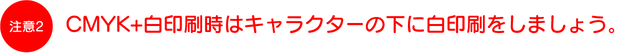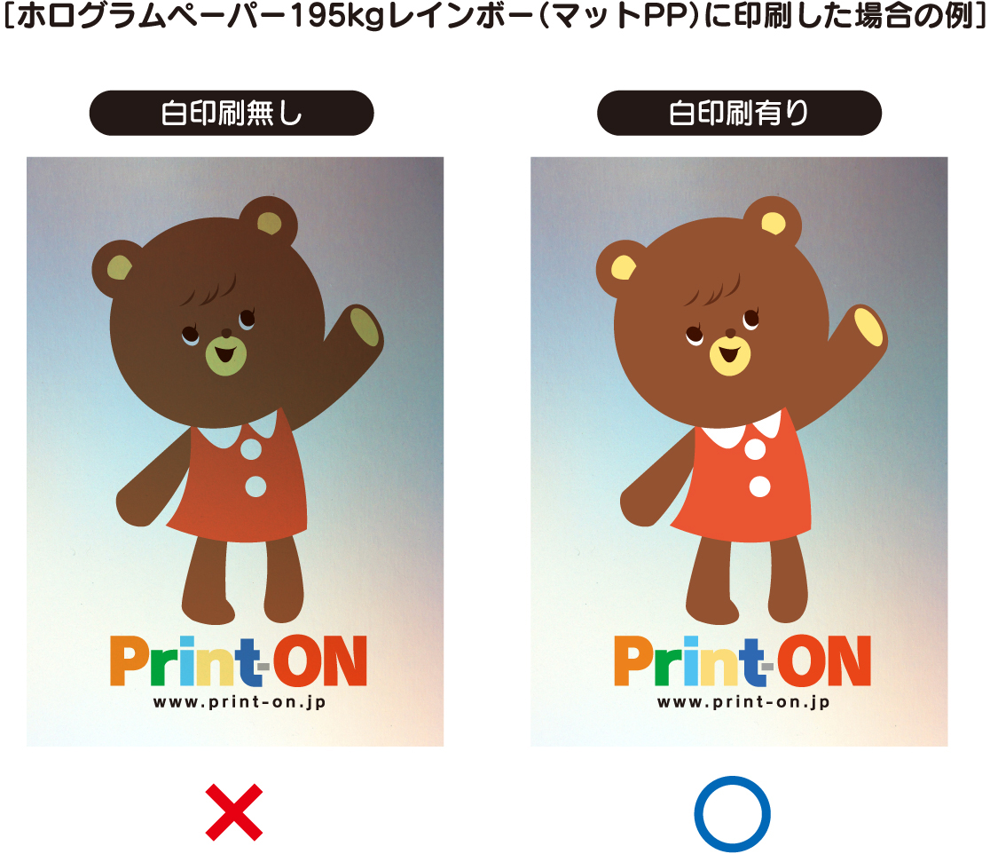 | メタル/ホログラムペーパーやおとぎのくに、ジュエルペーパーをご利用される場合、白印刷を施さなけれ ば下地の色が透けて見えるので絵柄が目立たなくなり、色味も下地の色を強く反映して変わってしまいます。キャラクターなど色味が変わって困るような絵柄部分の下地には白印刷(白100%)を引いて下さい。 |