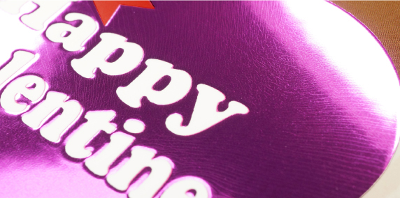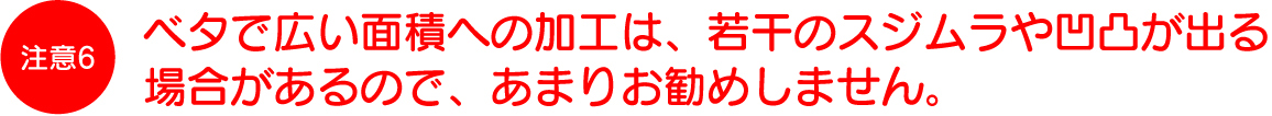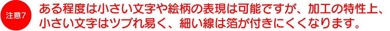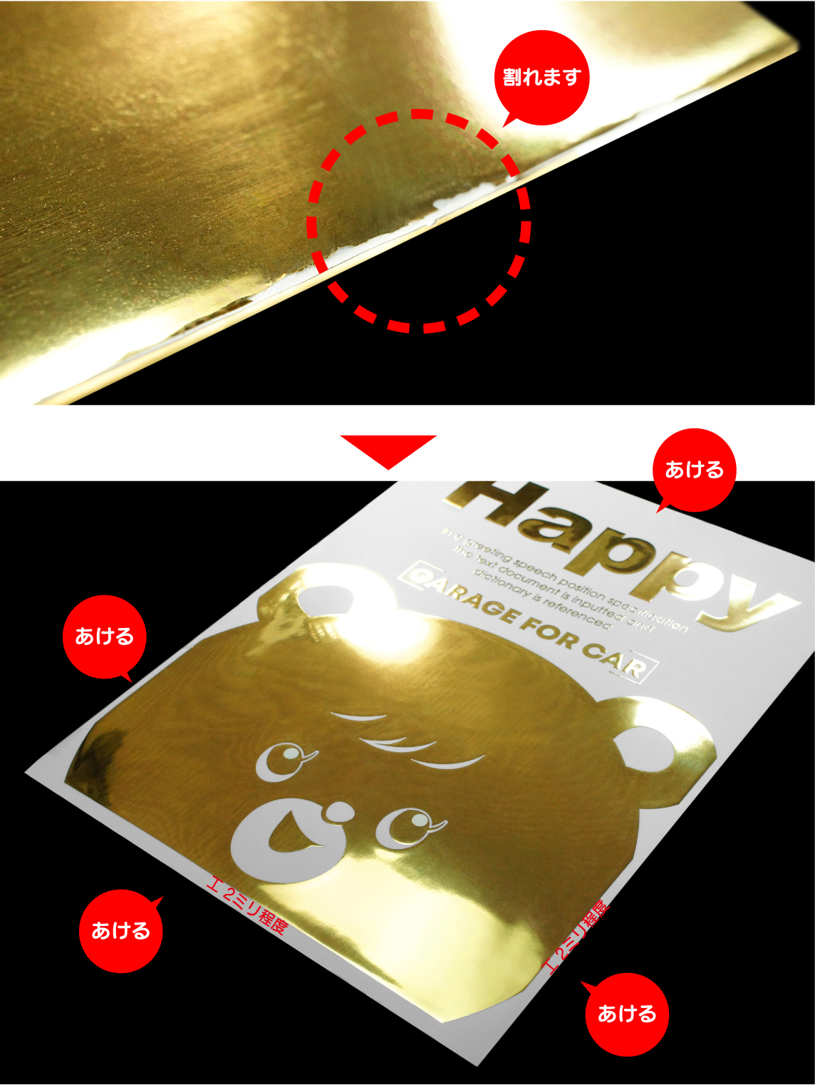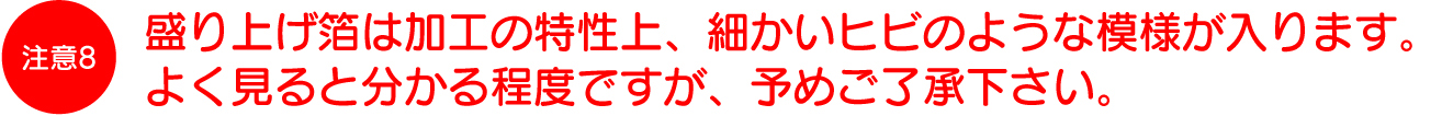 | 広いベタ面積の加工の場合、盛り上げ箔加工機の都合上、若干のスジムラや気泡跡が発生する場合があります。酷いものは不良品として弾くようにしていますが、若干のスジムラや気泡跡のあるものは良品として作業を進めさせて頂きます。予めご了承の上ご発注下さい。。 |