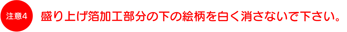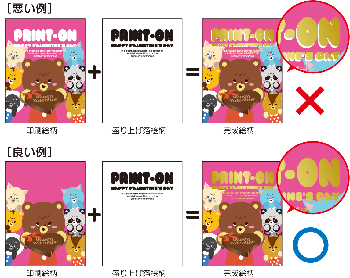 | 盛り上げ箔加工は印刷と作業工程が別なので、フルカラー印刷データと若干のズレが生じます。盛り上げ箔部分の下の印刷絵柄が白くなっていると、盛り上げ箔加工がズレた時に、白が見えてしまいます。 多少ズレても問題ないように盛り上げ箔加工部分の下にも絵柄を描いて下さい。 |
