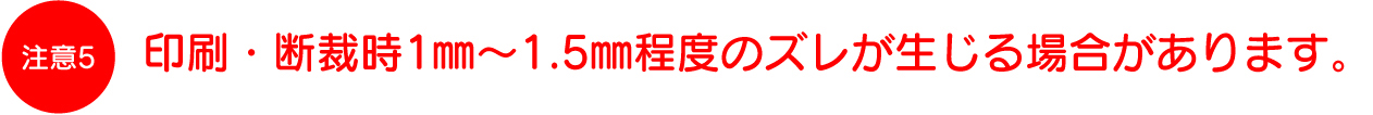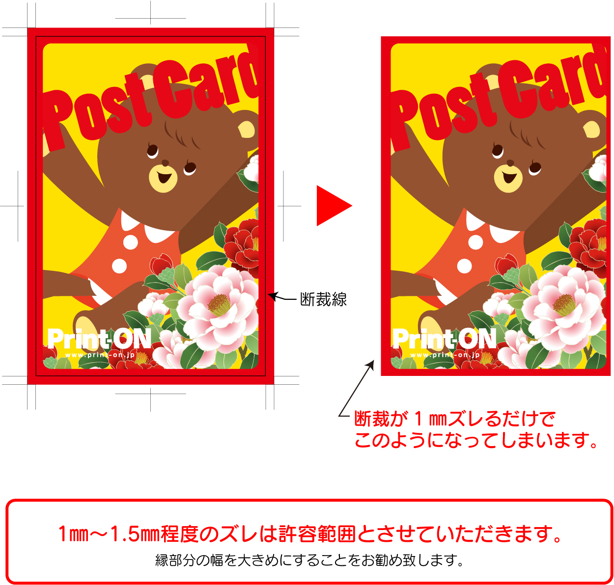 | ポストカードはサイズが小さい為、印刷や断裁の際に若干のズレが発生いたします。その為、1~1.5㎜程度はズレが生じても大丈夫なデザインで作成してください。特に縁があるようなデザインの場合、微少なズレでも上下左右の縁の幅が変わる為、目立ち易くなりますのでご注意ください。 |