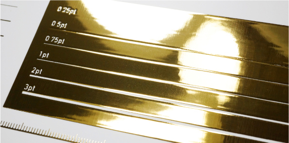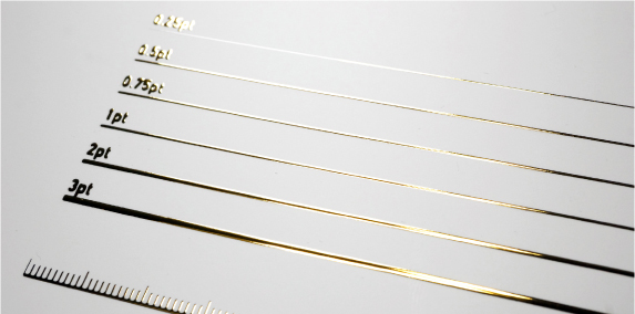 | 盛り上げ箔加工は、盛り上げ用ニスの上に箔を転写する加工です。最新鋭の加工機ですので、かなり細かい文字や絵柄の表現が可能ですが、どうしても箔を転写するという加工の特性上、盛り上げ用ニスが密集した細かい部分箔は箔がツブれ気味に転写され、細すぎる線等は箔が転写されない事があります。(1pxの線は箔が転写されません)データ作成時はご注意下さい。 ※特にベタ白抜きで小さい文字がある場合は、文字を太く・大きくしないとツブれが発生します。 ※箔の種類により、着きが弱い箔もあります。予めご了承下さい。 |