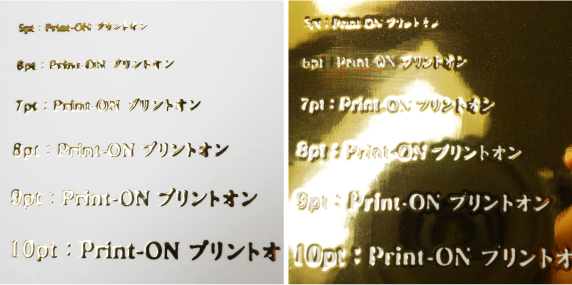 | 写真左のように6pt以下は箔がうまく転写されず、ツブれたり、カスれたりします。 写真右のようなベタ白抜きの文字の場合は特にツブれ易いです。 |