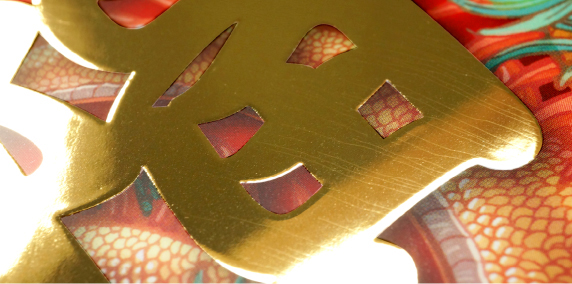 | 盛り上げ箔加工は、環境の変化による「盛り上げインク」と「箔フィルム」の伸縮の違いにより、箔フィルムに微細な「ひび割れ線」が入る場合があります。光にかざして、よく見ないと分からない程度ですが、予めご了承下さい。特に「2回盛り上げ箔加工」や「3回盛り上げ箔加工」等、機械に何度も通す(熱をかける)ことで「ひび割れ線」が入り易くなります。柄の入ったホログラムやマット系の箔は「ひび割れ線」がほとんど目立ちません。 |