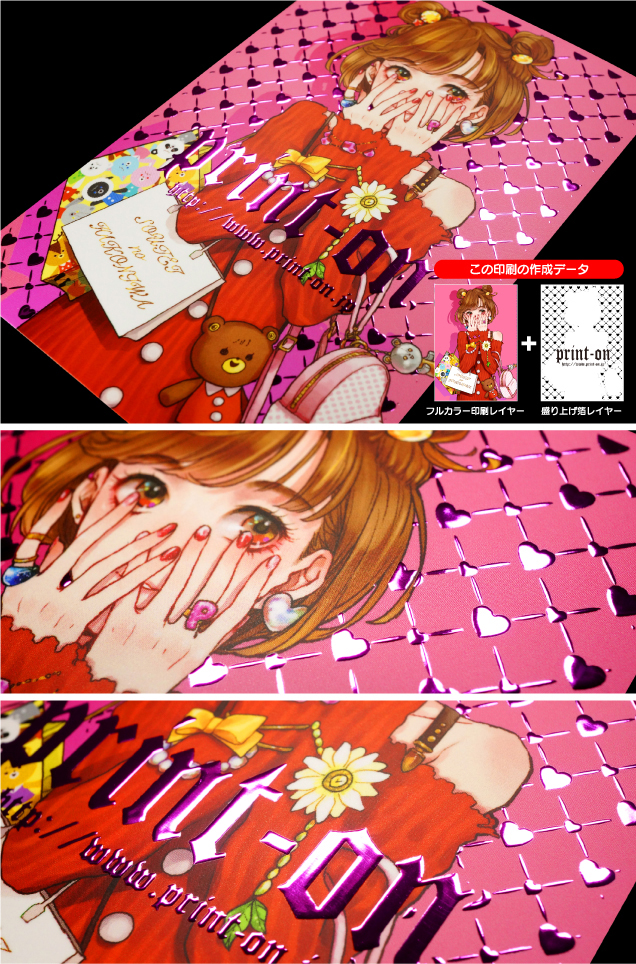 | コートカード紙180kg/フルカラーRGB印刷(デジタルオフセット印刷)/マットPP 盛り上げ箔加工:ピンク |