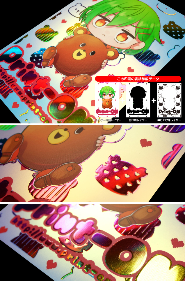| コートカード紙180kg/フルカラーRGB印刷/マットPP/盛り上げ箔加工:虹 「虹」は斜め方向にグラデーションで色が変わる面白い箔です。 |