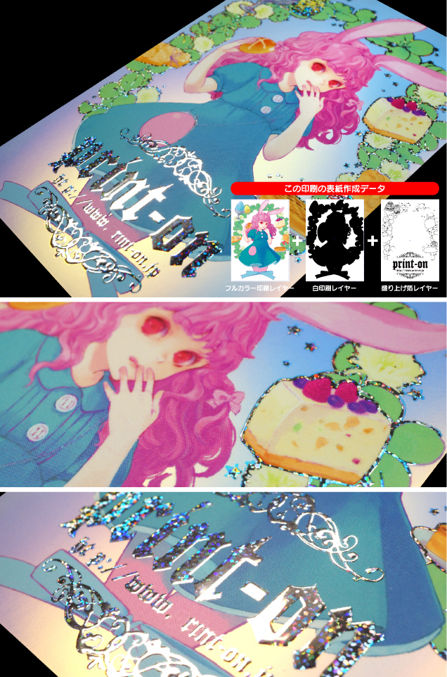 | コートカード紙180kg/フルカラーRGB印刷/マットPP/盛り上げ箔加工:シティライト虹 「シティライト虹」は上下方向にグラデーションで色が変わる面白い箔です。 虹色にキラキラと輝きインパクト抜群の表紙が作れます。 |