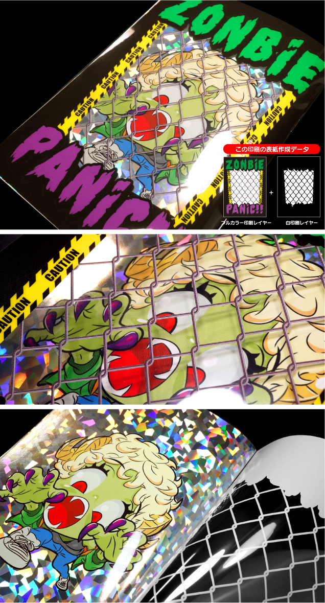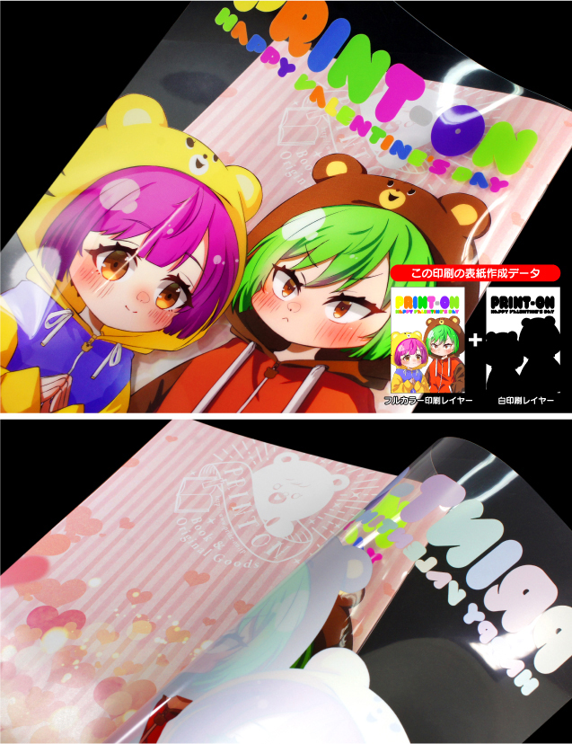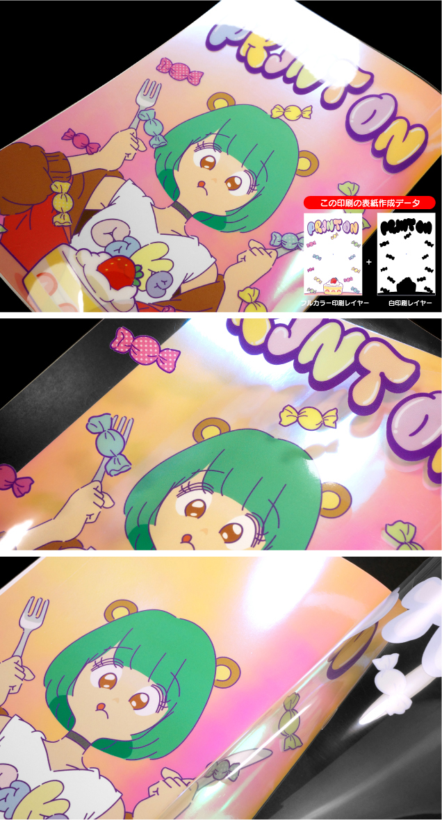 | 高透明フィルム200ミクロン/フルカラーRGB+白印刷 ピンクや紫、グリーン系が特に鮮やかになります。 |