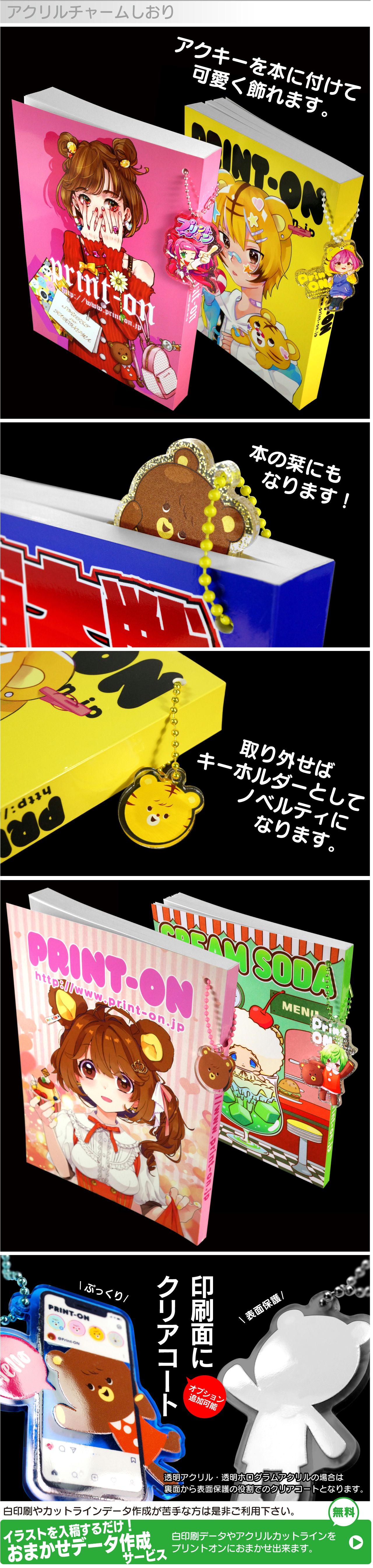 本に穴を空けてアクリルキーホルダーを装着して、可愛い飾りにできます。 本に挟めば、栞としても使えるアクリルチャームとなります。 取り外せばキーホルダーとしても使えるので本のノベルティとしてもお勧めです。 沢山の種類のアクリルの材質から選択可能です。 フルカラー+白印刷対応で自由な形にカットして作ることが出来ます。 |