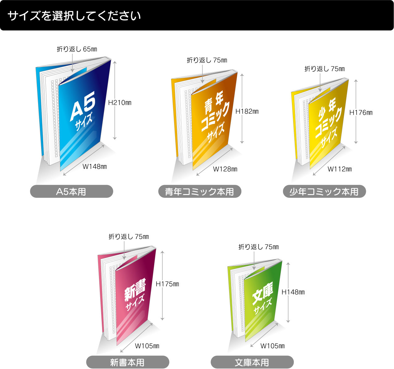 | ※新書サイズや文庫サイズやコミック本サイズは他社様と規格が違う場合があります。 片袖(表1側)のみ折り線を入れて納品しますので巻けないことは無いですが、背部分の 位置が逢わない事や天地の高さが合わない場合がございますので、予めご相談下さい。 |