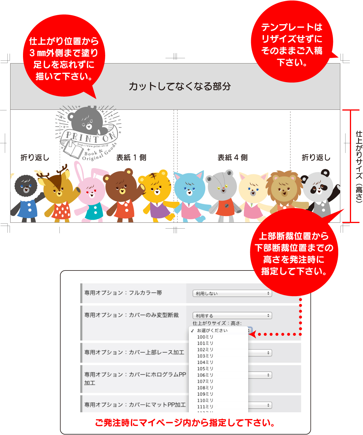 | カバーの仕上がりサイズを指定して下さい 上部の断裁位置から、下部の断裁位置までの仕上がりサイズが「カバー仕上がりサイズ」です。 そのサイズをマイページ内からご発注時に指定して下さい。 |