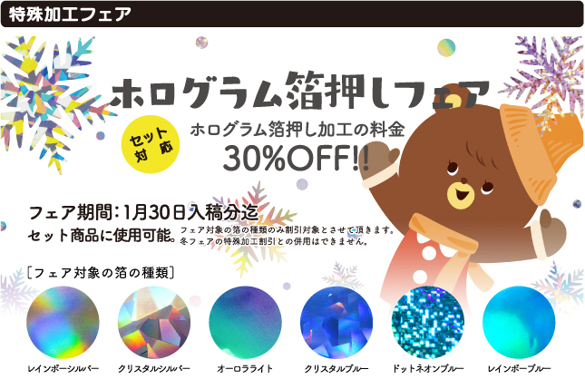 | フェア概要 | 特殊加工の「ホログラム箔押し加工」の加工料金を30%割引価格でご利用頂けます。但し、フェア対象の箔の種類に限ります。対象の箔の種類は「レインボーシルバー」、「クリスタルシルバー」、「オーロラライト」、「クリスタルブルー」、「ドットネオンブルー」、「レインボーブルー」の6種類です。 |