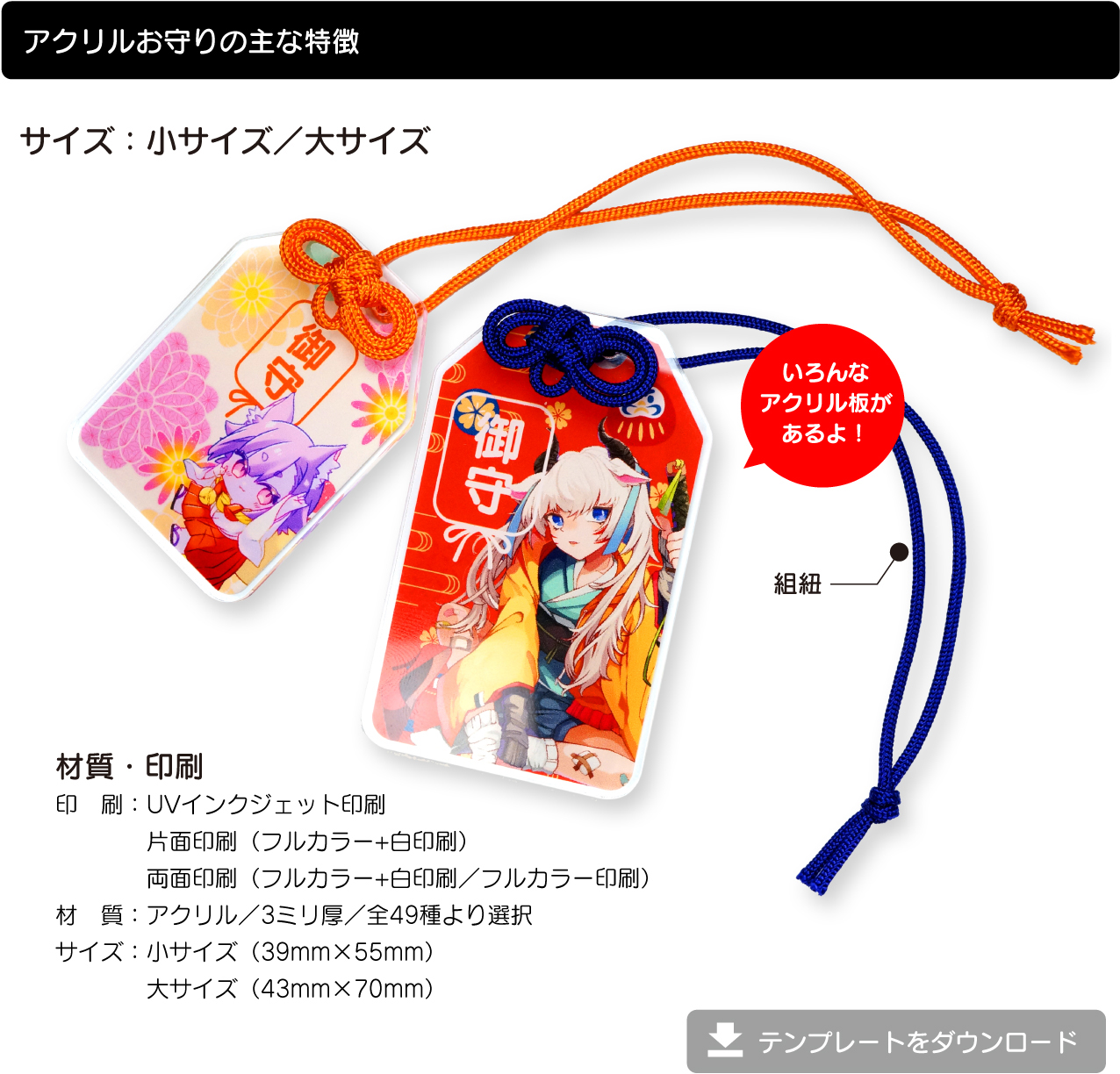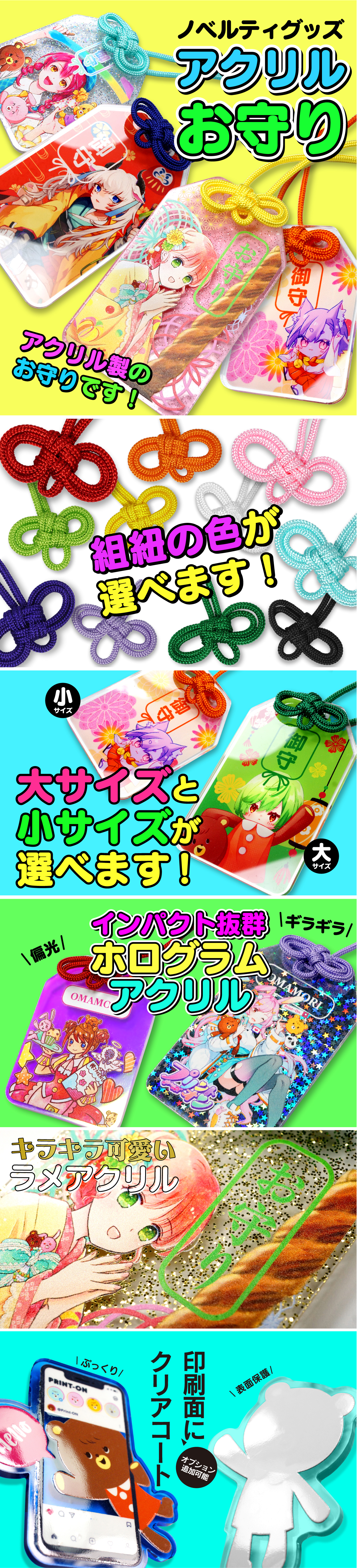 ノベルティグッズや記念品としてアクリル製のお守りが作れます。 いろんなアクリルの種類を選べます。 フルカラー+白印刷対応です。 |