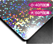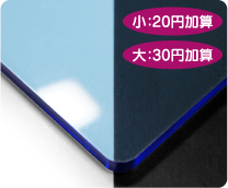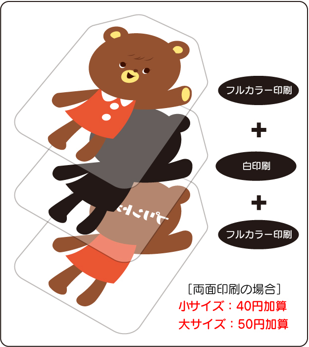 | 印刷面にクリアコート 印刷部分に光沢っと厚みのあるクリアインクでコーティングします 小サイズ:1個30円加算 大サイズ:1個40円加算 1営業日加算 |