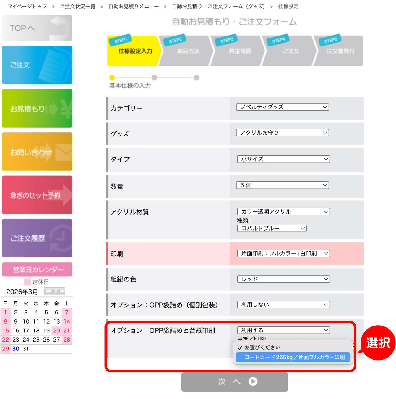 | マイページでのご注文時に「オプション:OPP袋詰めと台紙印刷」の項目で「利用する」を選択して、 用紙と印刷方法を選択下さい。 |