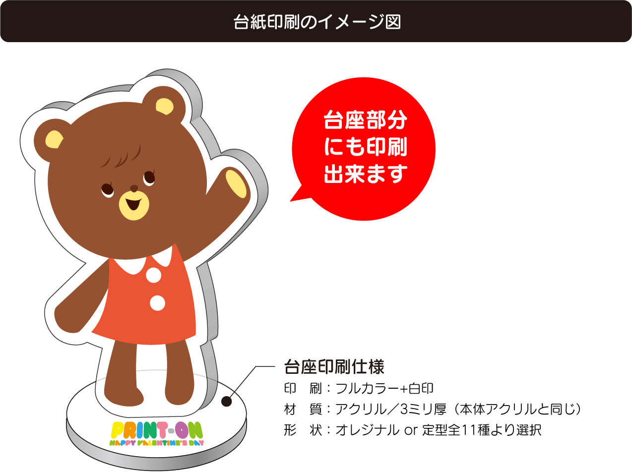 | 台座部分にフルカラー+白印刷で印刷出来ます。 台座のアクリル材質は本体と同じアクリルとなります。 台座部分にもフルカラー+白印刷で印刷が可能です。 対応するサイズの台座テンプレートをダウンロードして絵柄を描いて、本体データと一緒に入稿してください。 台座のアクリル材質は「選択された本体アクリルと同じ」ものを使用します。 ※サイズにより加算料金が変わります。 ※締切が1営業日加算されます。 |