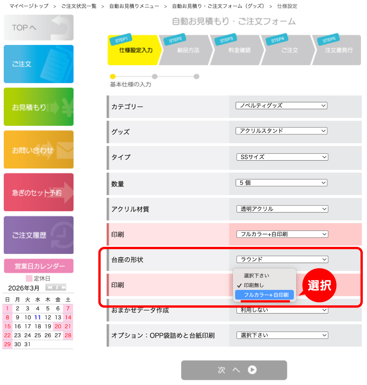| マイページでのご注文時に台座の形状」を選択すると、「印刷」を選択する項目が 表示されますので「フルカラー+白印刷」を選択下さい。 |
