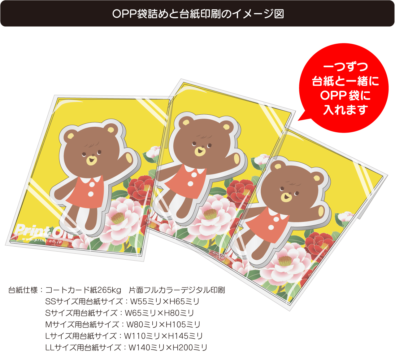 | OPP袋詰めと台紙印刷 (台紙はコートカード紙265kg/フルカラー印刷) |
