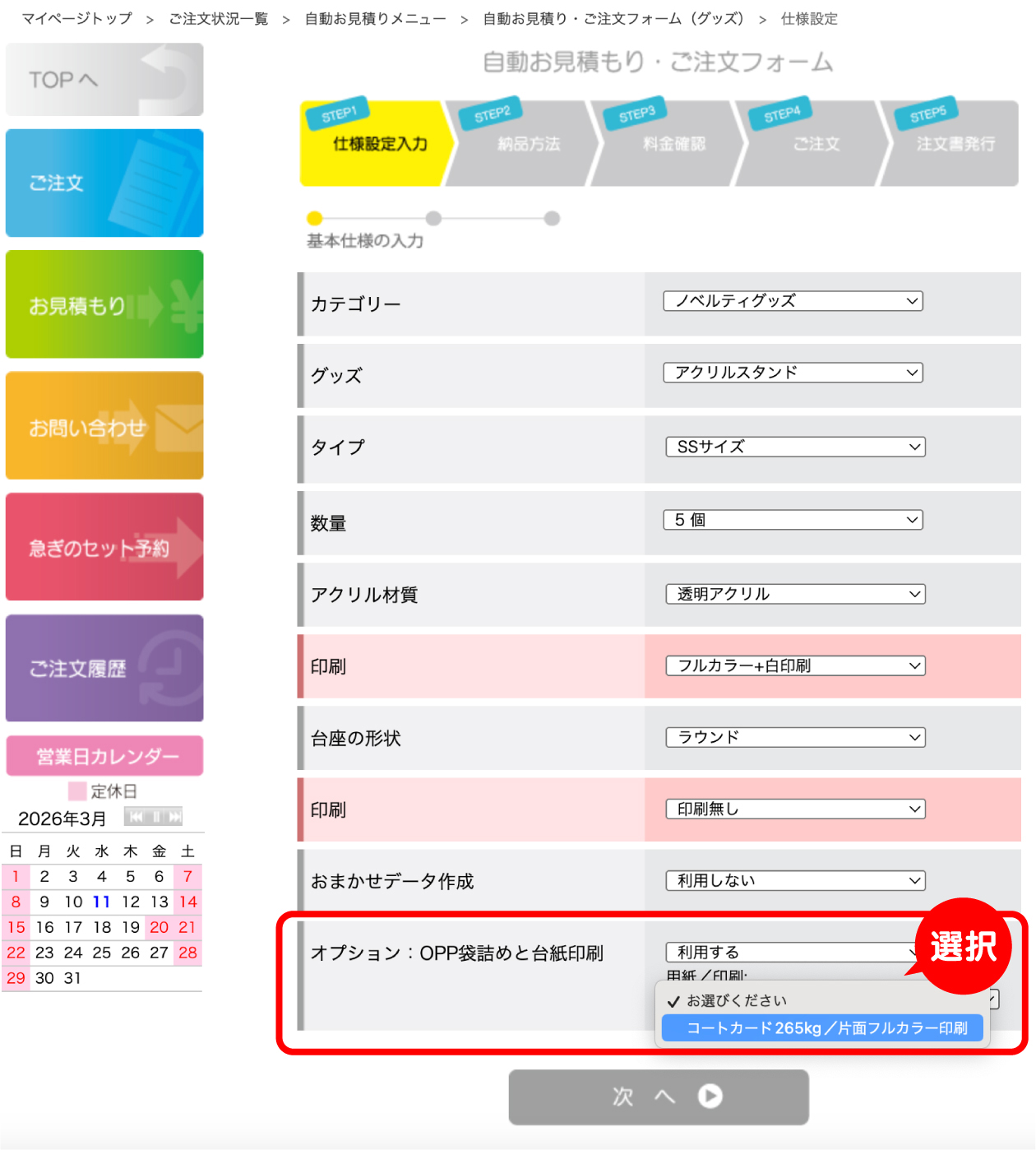 | マイページでのご注文時に「オプション:OPP袋詰めと台紙印刷」の項目で「利用する」を選択して、 用紙と印刷方法を選択下さい。 |