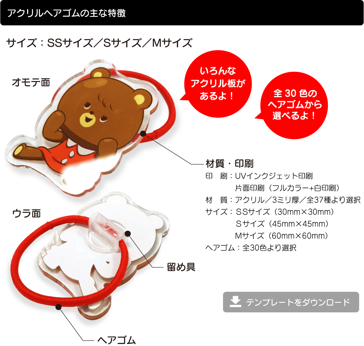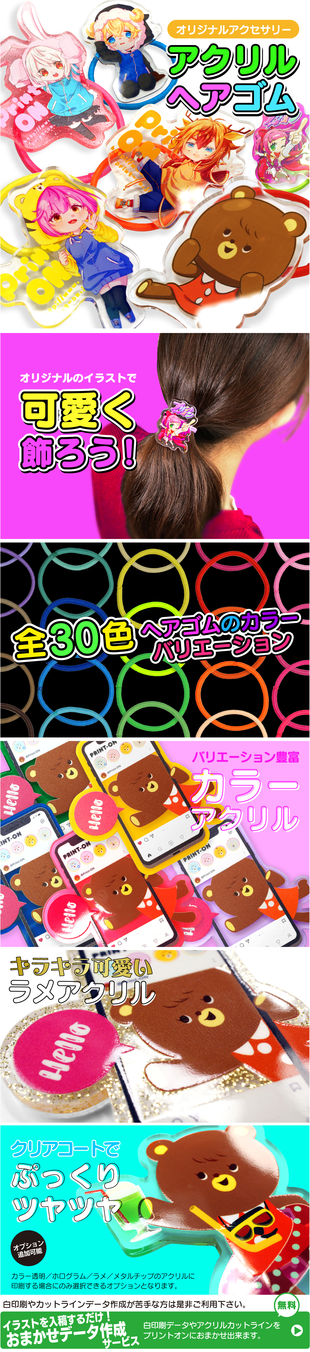 可愛いアクリルタイプのヘアゴムです。いろんなアクリル素材が選べて フルカラー+白印刷対応。自由な形にカットして作ることが出来ます。 |