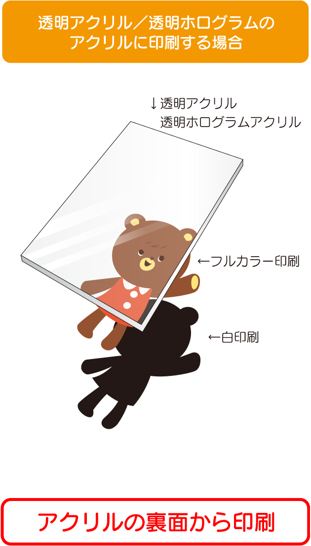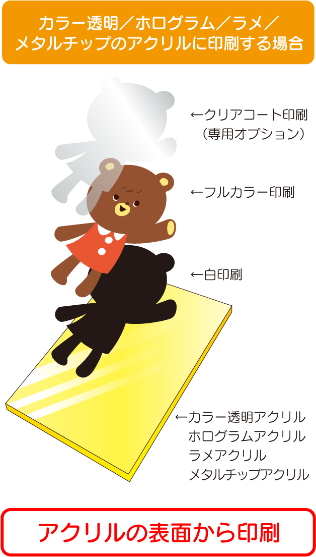 選択されたアクリルの材質により印刷方法が変わります。 |