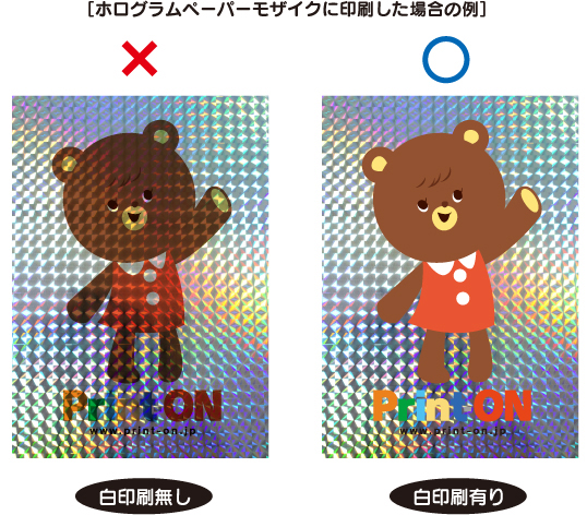 | ホログラム紙に印刷する場合、白印刷を施さなければ下地の色が透けて見えるので絵柄が目立たなくなり、色味も下地の色を強く反映して変わってしまいます。キャラクターなど色味が変わって困るような絵柄部分の下地には白印刷(白100%)を引いて下さい。 |