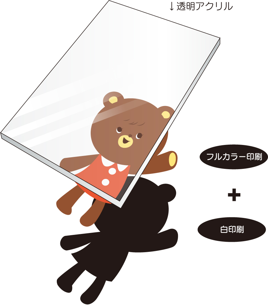 | 印刷はアクリルの裏面から「フルカラー(CMYK)+白印刷」となりますので 表面はアクリルの質感でピカピカです。(UVインクジェット印刷) |