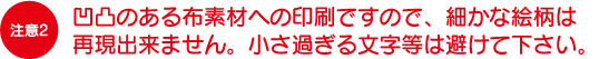 | 凹凸のある布素材への印刷となりますので、凹凸により小さな文字は読めなくなる場合があります。 線の細い文字や10pt以下の文字は出来るだけ避けて下さい。 特にベタ部分に白抜きの小さな文字は見えづらくなります。 |