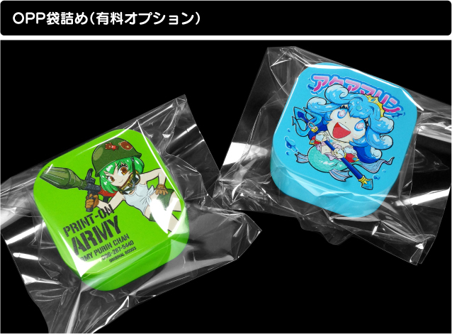 | 1個ずつOPP袋に入れて納品致します。 ブリキ缶ケースのサイズに合ったOPP袋に入れて納品致します。 ※締切が1営業日加算されます。 ※1個20円の加算料金が発生します。 |